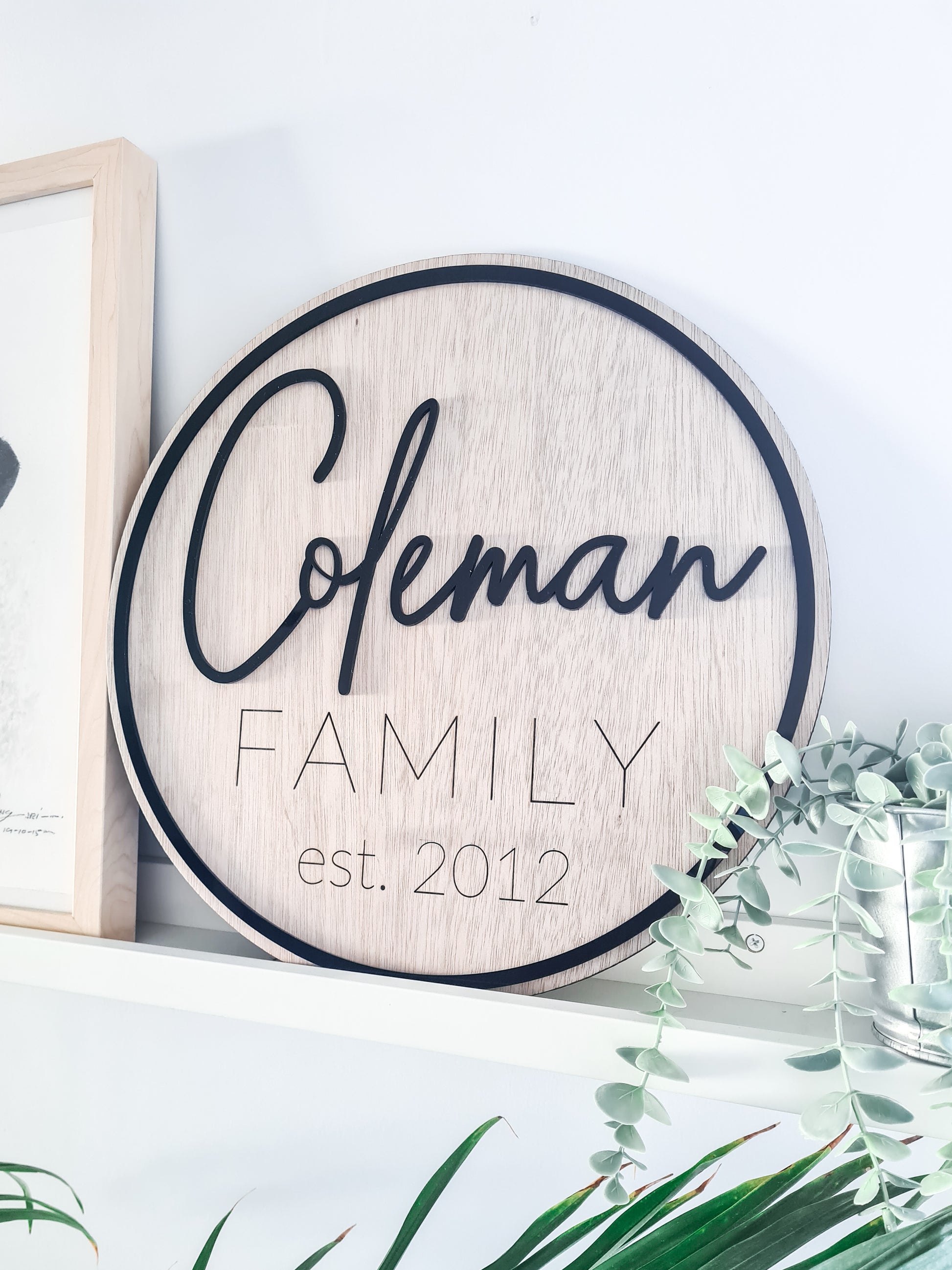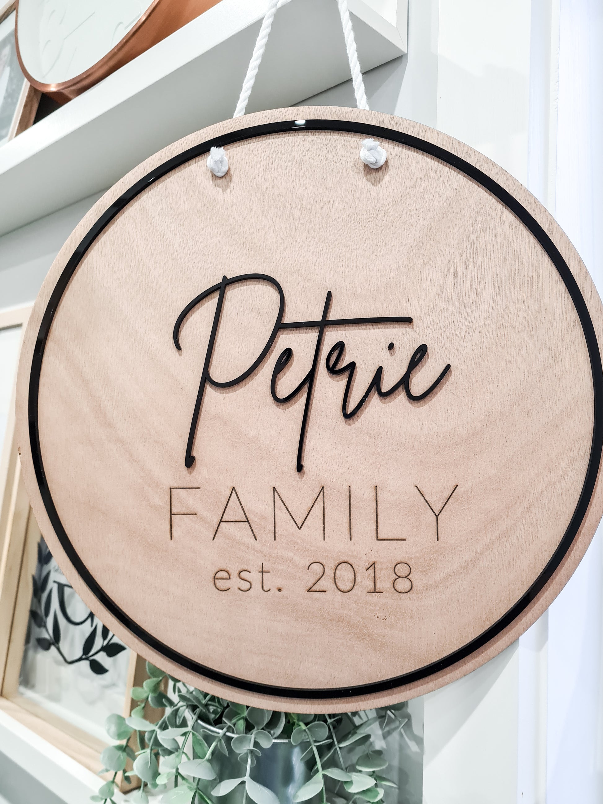 We use the finest of 3-4mm thickness timber to create each piece and as a result, each holder is unique in wood grain, and may also have slight shade variances. They are considered to be a light to medium timber colour. The personalised name and outter black circular border will be cut from the finest quality black acrylic and fixed with professional grade adhesive, and the word 'FAMILY' and 'est. .....' will be engraved using our laser cutter.
