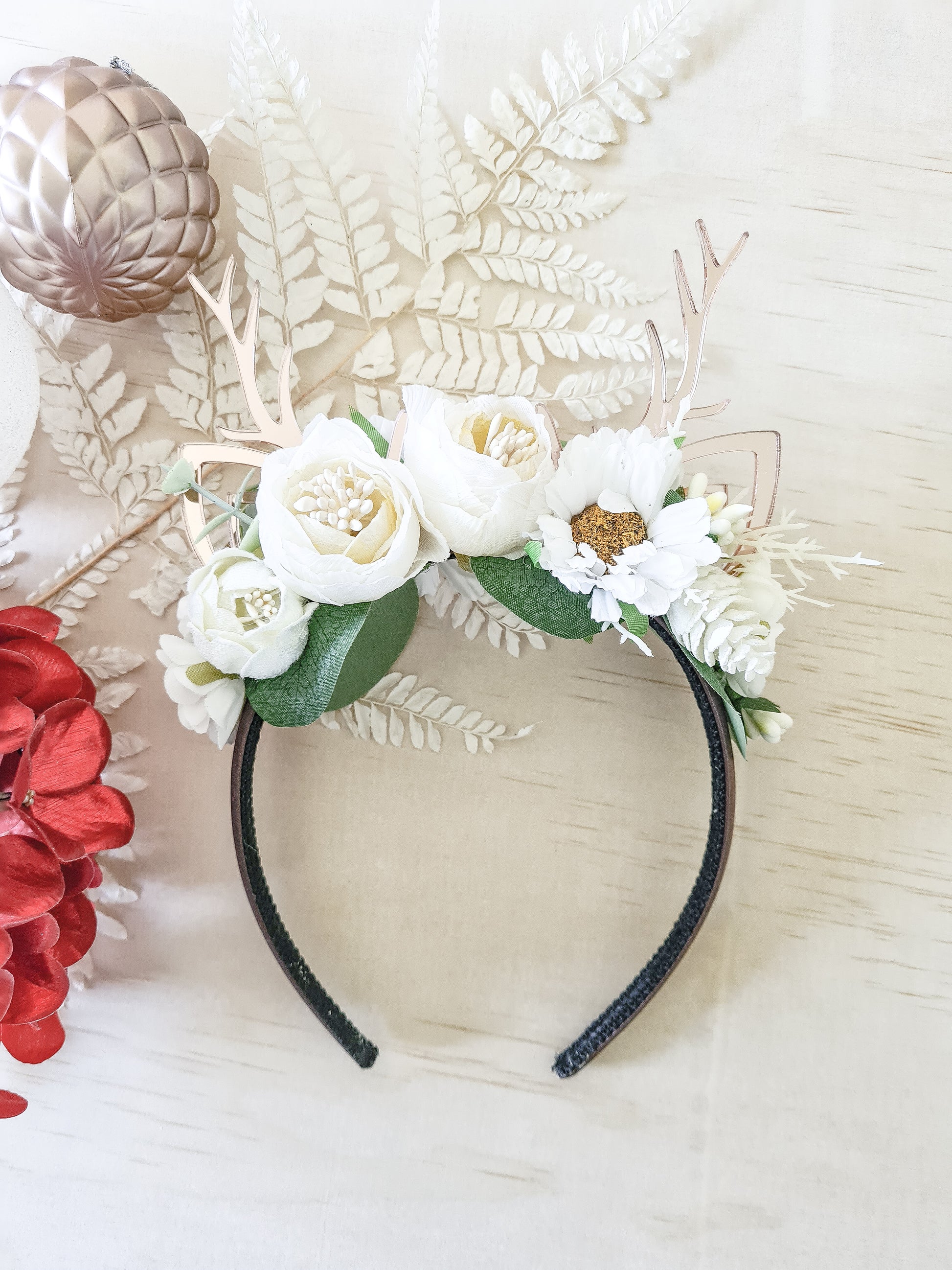 Make your princess's Christmas that little bit more magical with this adorable Flower Headband featuring the sweetest rose gold reindeer ears and antlers and a white/ivory theme for flowers! This headband is a must-have addition to complete any Christmas outfit.