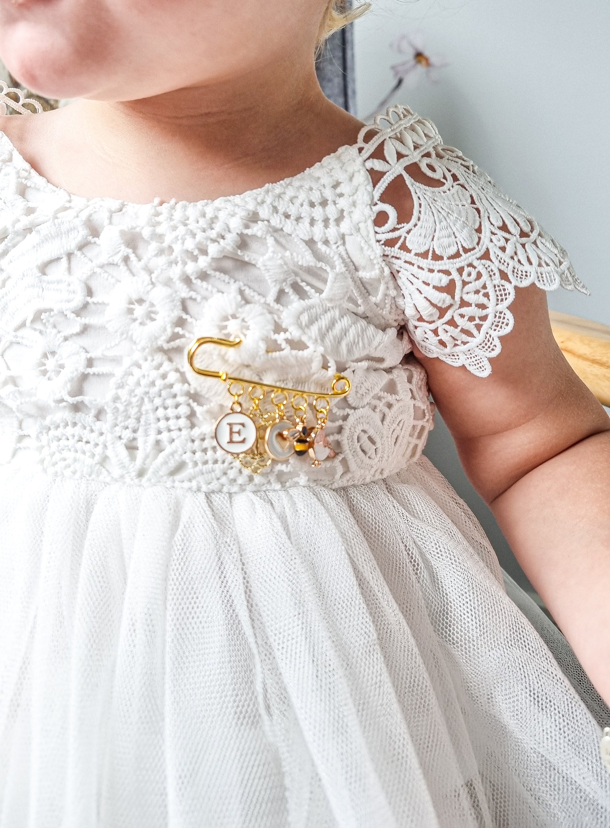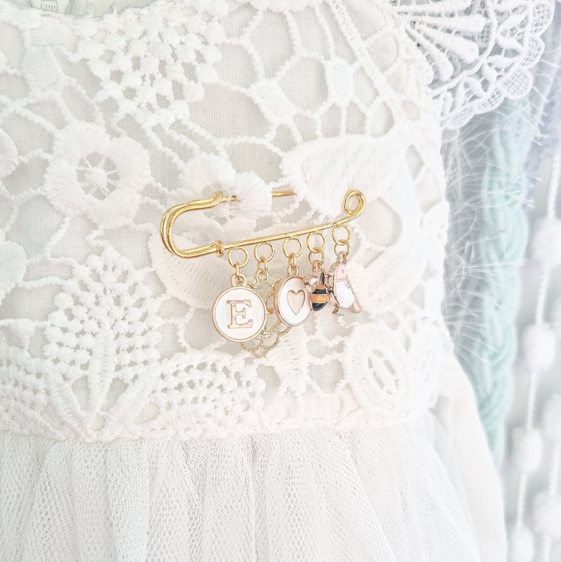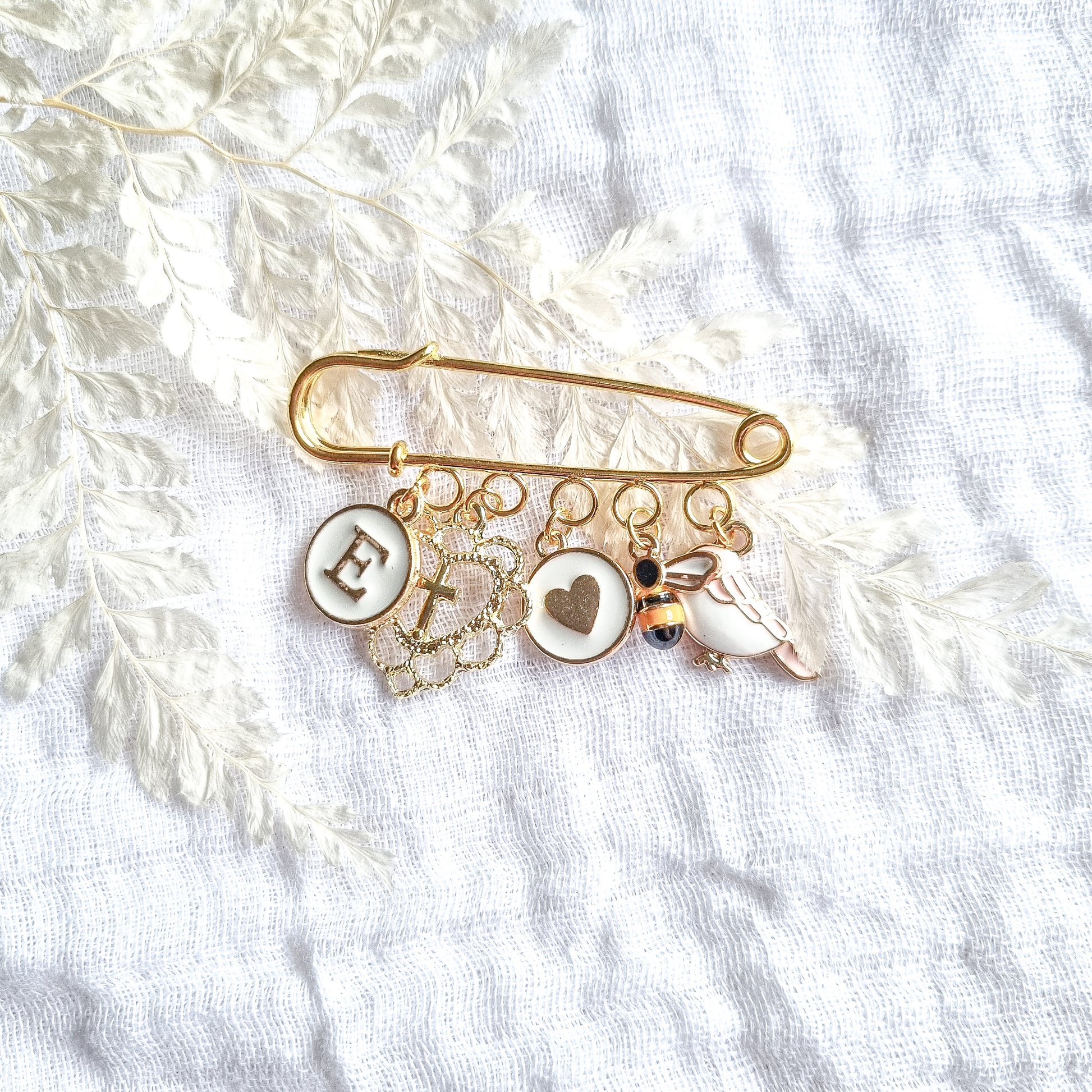 Our beautiful gold plated keepsake brooch / pin makes the most perfect Baptism, Christening, Naming Day, milestone birthday, bridal or memorial / remembrance gift for someone you love. This beautiful little pin has a selection of Five (5) charms included.