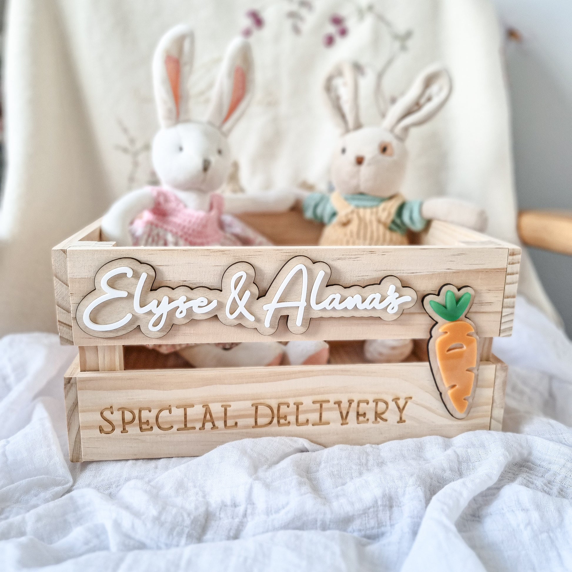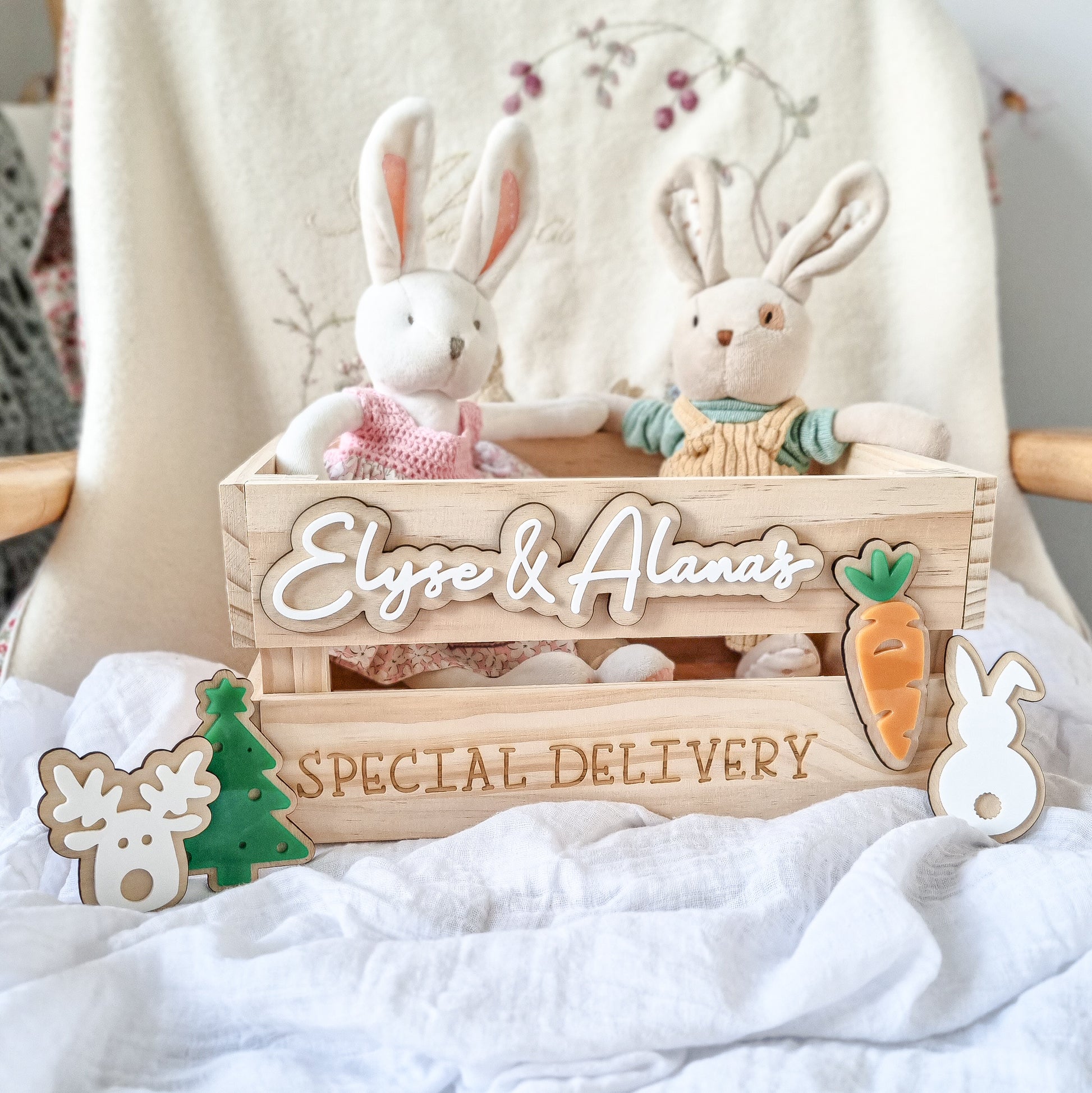 All crates come with ‘special delivery’ engraved into the crate, and 2 selections are required for interchangable graphics (carrot, bunny, reindeer or christmas tree).