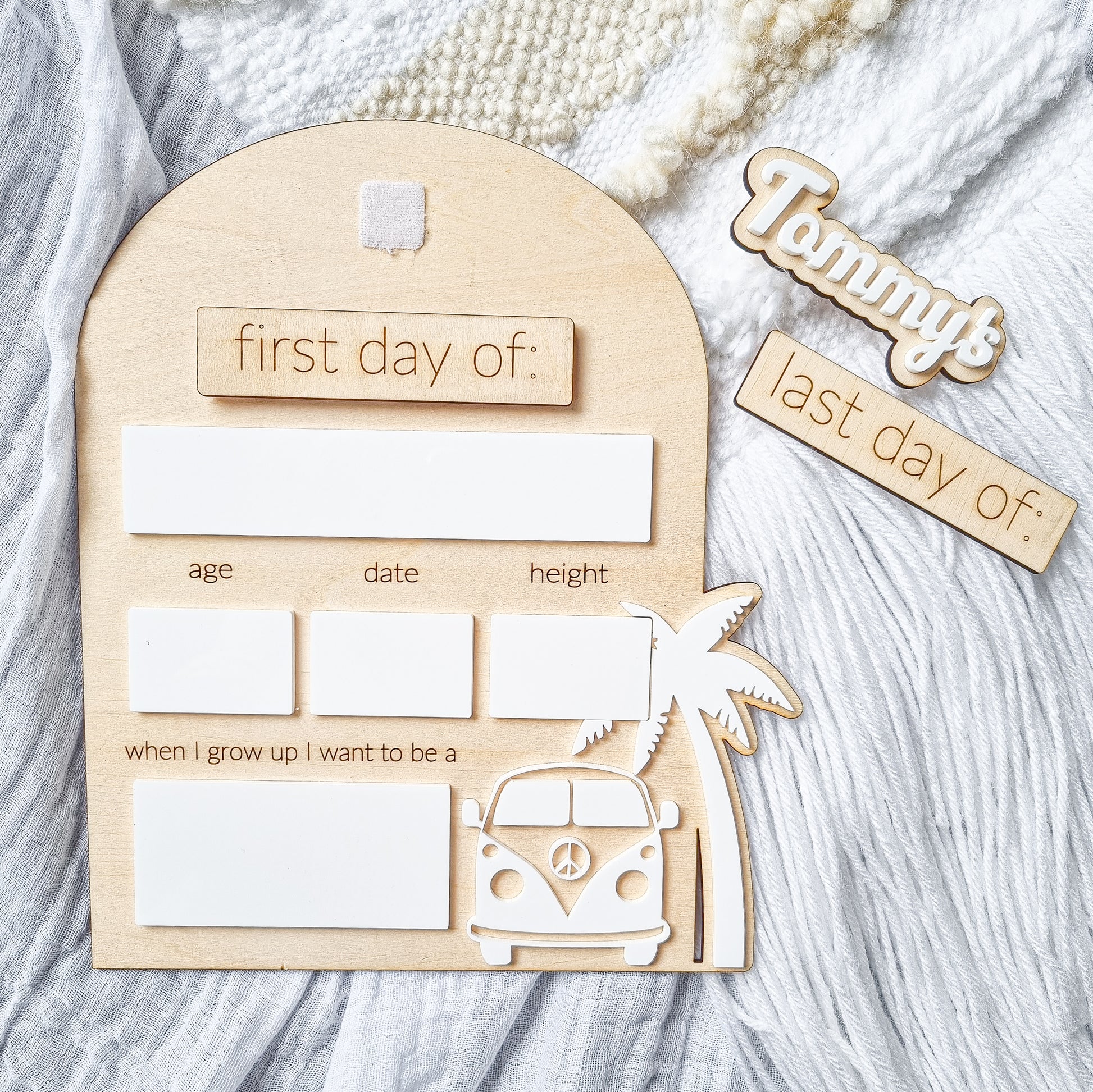 Purchase with one name (this will be non-removable - using industrial strength glue), or multiple names with velcro to easily interchange! 'First Day of' and 'Last Day of' comes with velcro attached so you can switch them out easily as well!