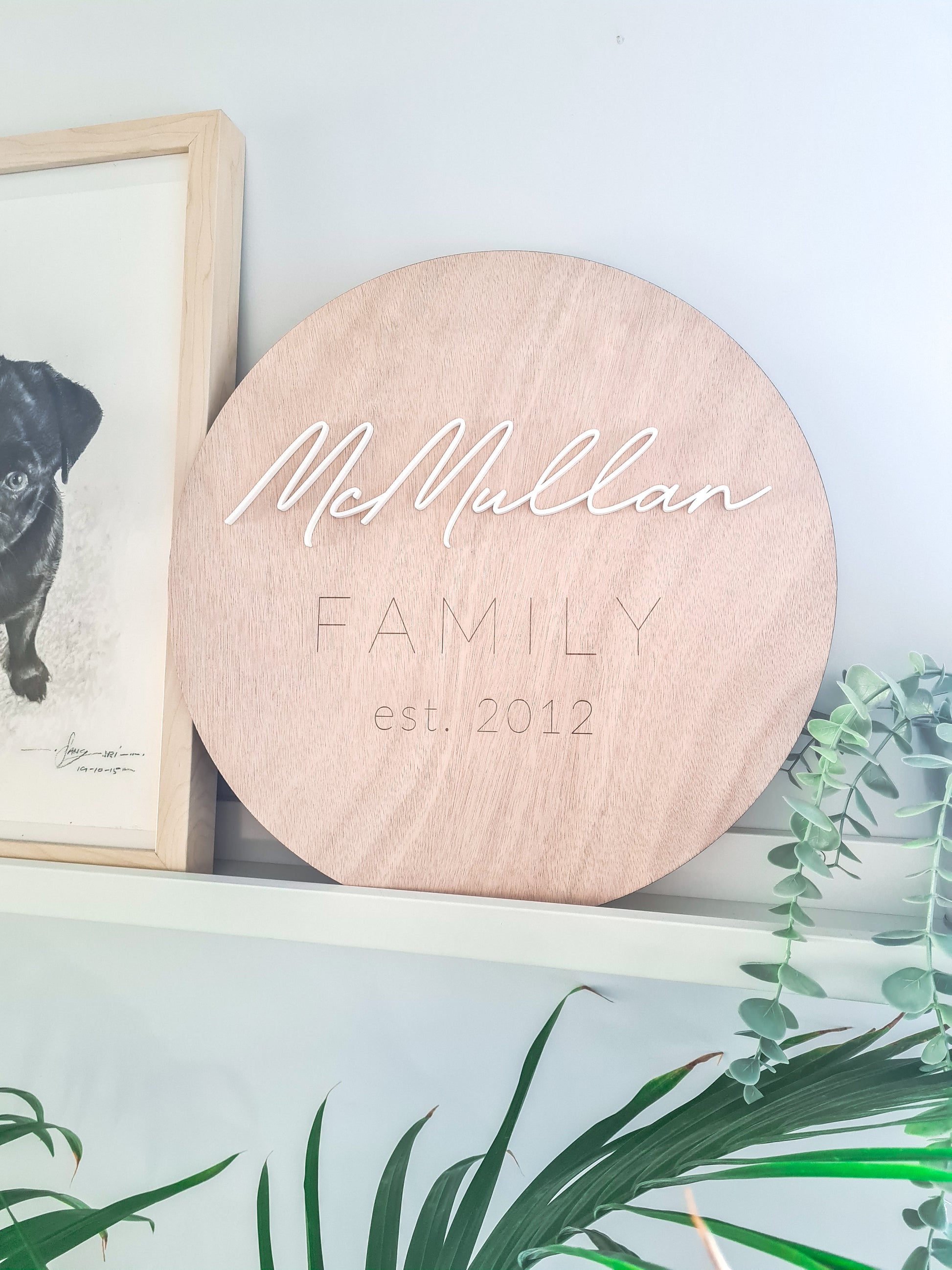 What a beautiful way to make a statement in your home - a personalised family plaque which is sized at 35cm in diameter. These gorgeous plaques can be created with holes and cotton rope for hanging, or without holes where it can be propped up on a shelf.